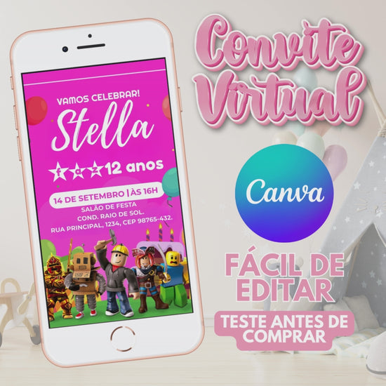 Roblox meninas convite editável no Canva. Roblox meninas convite Virtual. Roblox meninas. convite Digital. Convite template Canva.